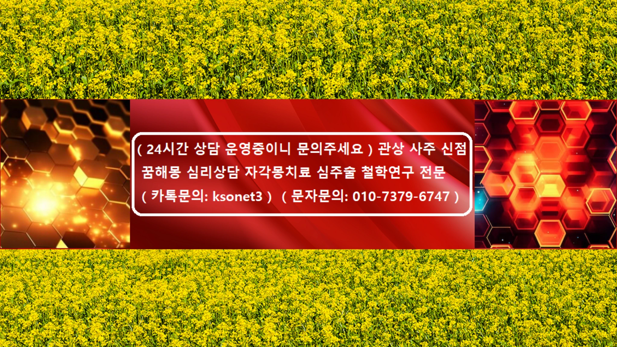 🌟 24시간 새벽 상담 🌟 🔥 여기를 누르시면 제가 운영하는곳이 전부 공개 됩니다 🔥 2024년 현재, 경력 19년차, 관상 사주 신점 꿈해몽 심리상담 자각몽치료 심주술 철학연구 전문 방송 입니다 새벽상담을 포함한 24시간 상담 운영하고 있습니다, 언제든지 문의주세요 카톡문의: ksonet3 문자문의: 010-7379-6747 희망궁 대표, 채은철학원 원장 - 점술가 꿈희망행운 드림 - #관상 #사주 #사주팔자 #꿈해몽 #운세 #타로 #신점잘보는곳 #신점 #무당 #무속인 #점집