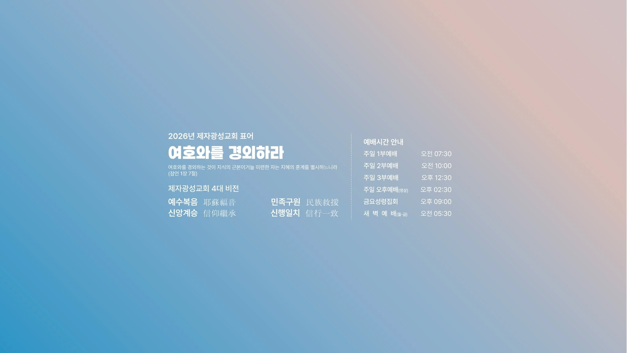 다음 세대를 준비하는 제자광성교회 공식 유튜브 채널입니다. 구독하시면 박한수 목사님의 최신 설교를 볼 수 있습니다. 대한예수교 장로회 제자광성교회 Jejakwangsung presbyterian Church 본성전 - 하늘마을 경기도 고양시 일산동구 하늘마을1로 72 아둘람센터 - 하늘마을 경기도 고양시 일산동구 고양대로838번길 11 비전센터 - 밤가시마을 경기도 고양시 일산동구 일산로 462 (정발산동 1140) * 제자광성교회 홈페이지를 참고하시기 바랍니다. 전화번호 : 031-976-7272 FAX : 070-8277-2525 헌금계좌 : 301-0170-1798-71 (농협, 제자광성교회)