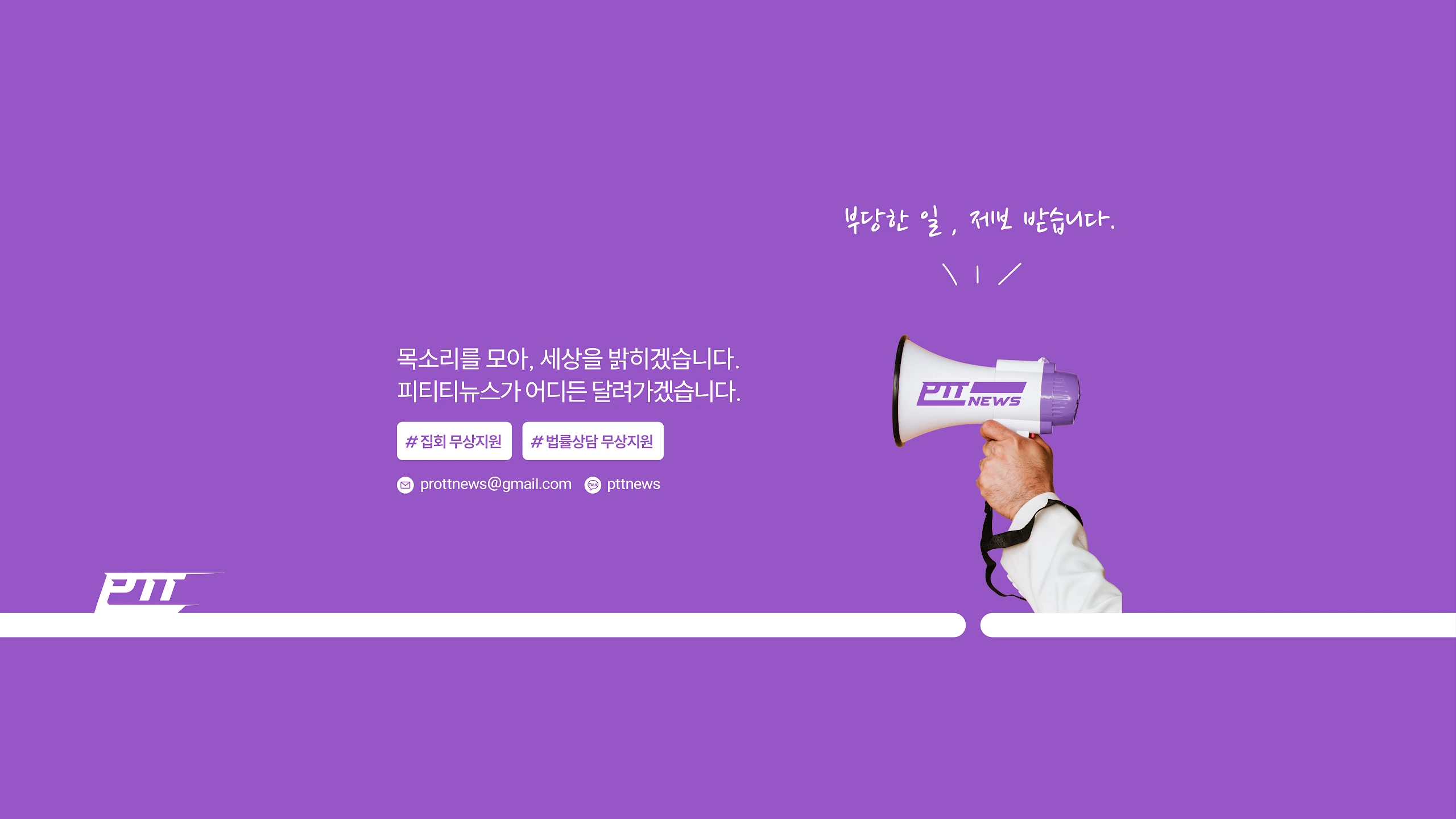 PTTNEWS(집회뉴스)는 올바른 집회 문화를 지향하고 부당한 일을 겪으신 분들에게 실질적인 도움을 드리는 언론사가 되겠습니다. 카카오톡채널 pttnews 혹은 [email protected] 으로 집회진행 및 법률상담 무상지원 신청해 주세요! 억울한 목소리가 더 멀리 퍼질 수 있도록 구독과 좋아요로 힘을 보태주시면 감사드리겠습니다! "부담 없이, 응원하는 마음으로 함께해 주시면 감사하겠습니다." [부담NO 자발적 후원 계좌] 우체국 50368002144009 김*경 제보는 [email protected] #집회뉴스 #pttnews #피티티뉴스 #제보 #집회 #시위 #사건사고