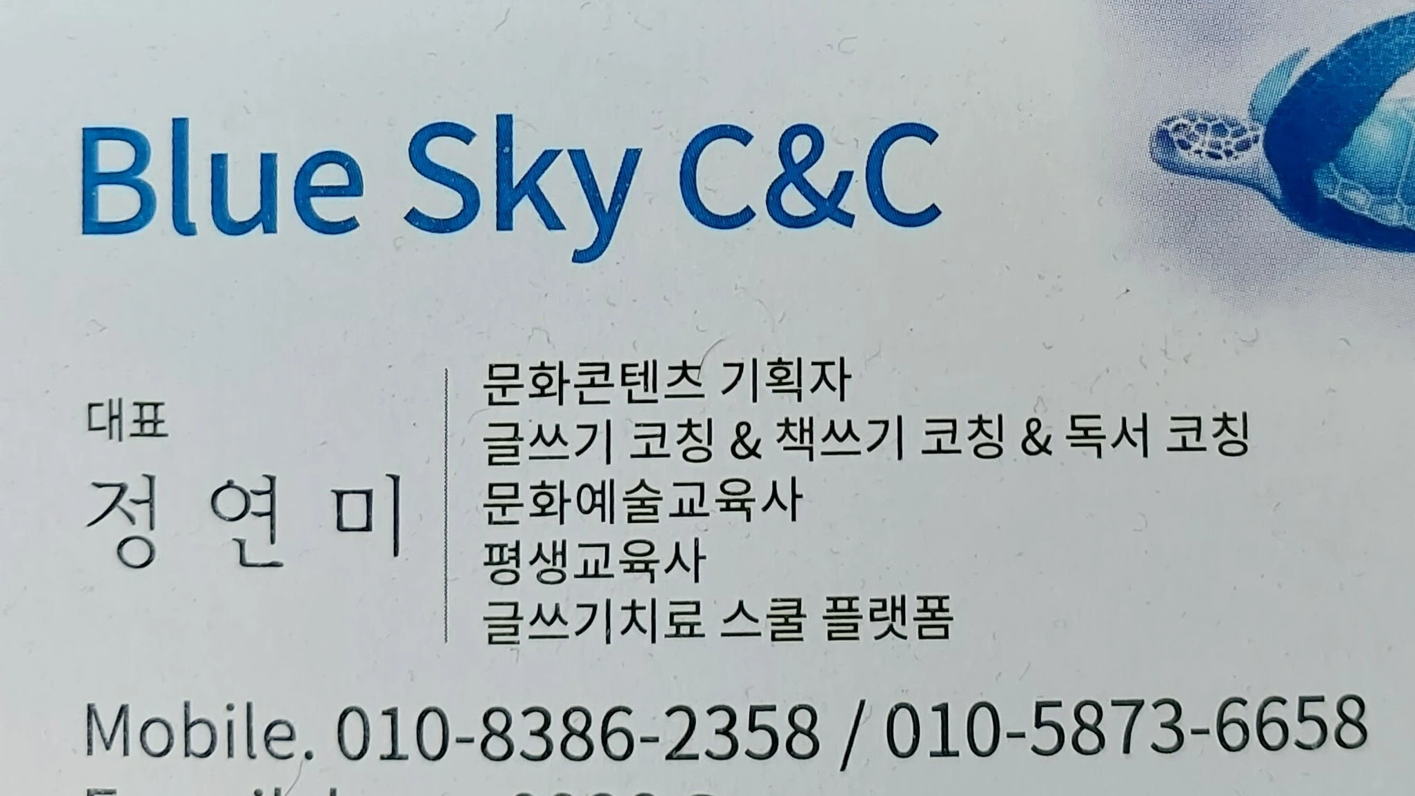 [블루스카이 문화콘텐츠 (Culture & Contents)] 글쓰기 치료 상담/문화콘텐츠 제작(전자책 출판)/ 문화예술교육/ 책쓰기 코칭/글쓰기 코칭/북콘서트. ★ 글쓰기치료 워크숍 ★ 글쓰기 강의 워크숍 ★ 전자책 만들기 워크숍 ★카테고리: 글쓰기치료 상담, 책쓰기& 글쓰기 교육, 강연, 문화콘텐츠 기획& 컨설팅 ★ 동영상 문서 파일 다운받기 https://blog.naver.com/lozan0928 ★ 글쓰기 치료상담, 코칭, 레슨과정, 리뷰, 워크숍 공지 네이버블로그 : 블루스카이 문화콘텐츠(C&C) https://blog.naver.com/lozan0928 https://www.facebook.com/lozan0928 ★강연 및 협찬 상담 [email protected] ■ 영상콘텐츠 후원계좌 카카오뱅크(정연미) 3333- 34- 2376735 ★ 연락처 010 5873 6658 010 8386 2358