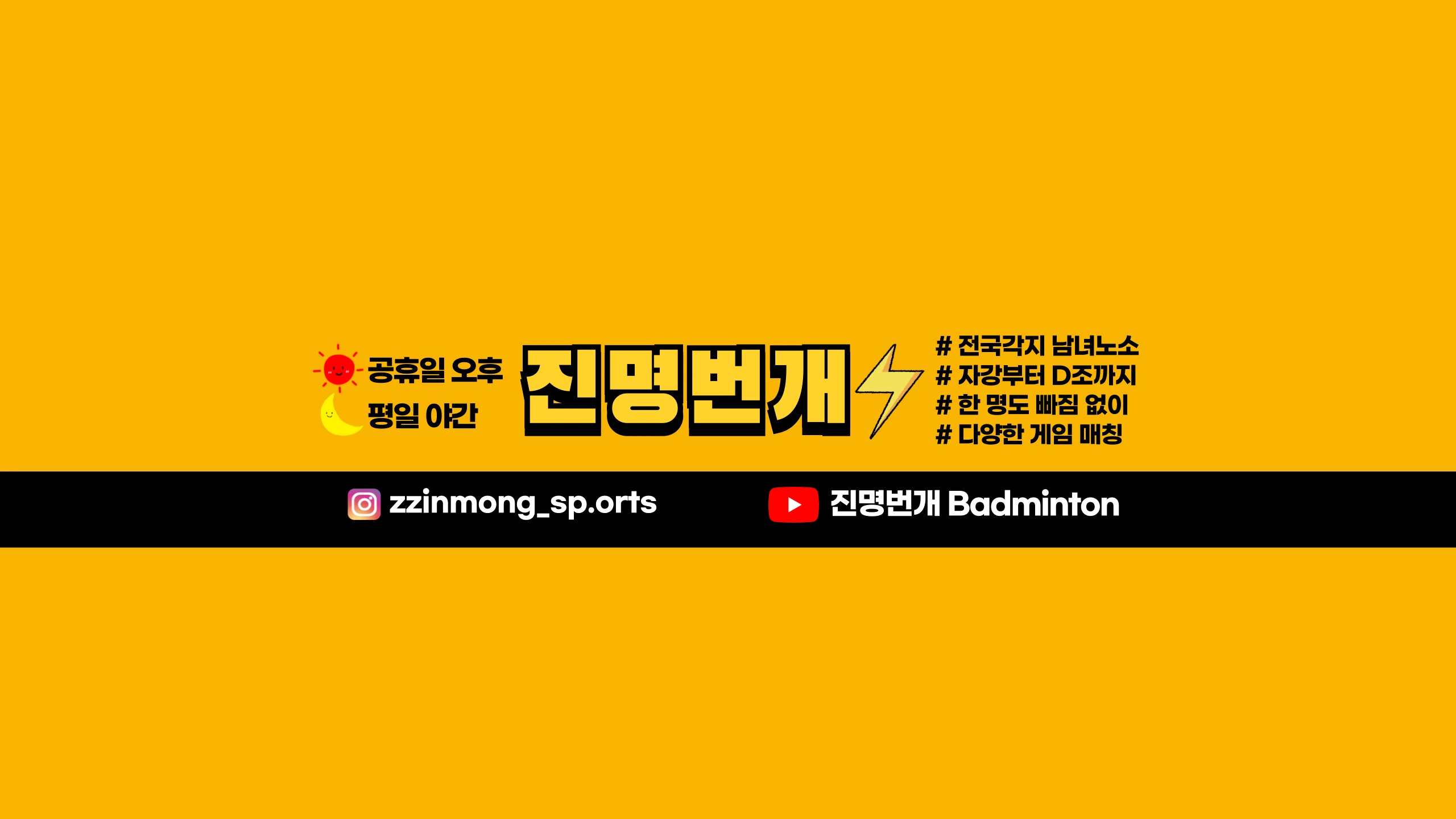⚡️진명번개⚡️참가 신청 프로필 링크 ! ◾️WHAT? 영남권에서 가장 핫한 배드민턴 번개 ◾️WHO? 전국 각지의 자강부터 D조까지 누구나 자유롭게 참여 ◾️WHEN? 공휴일 오후 / 평일 야간 ◾️WHERE? 부산 배드민턴 센터 ◾️WHY? 급수 / 나이 상관 없이 모두가 어울려 행복민턴치기 위해 ◾️HOW? 주인장 이진명이 직접 한 명도 빠짐없이 다양한 게임 매칭 📺채널소개📺 ❤️진명번개 현장스케치 : 대회, 모임, 행사 등 다양한 현장의 VLOG 🧡배드민턴대회 : 배드민턴대회 영상 💛진명번개 PLAY : 진명번개에서 함께 땀 흘리는 모두를 담는 경기 영상 💚레슨 영상 : 배드민턴 꿀팁 / 실력 성장을 위한 노력 에피소드 💙제품리뷰 : 배드민턴 용품에 대한 상세하고 솔직한 후기 🤎라떼민턴 : 부산 엘리트선수출신 2040 배드민턴 팀 '리셋‘ 🤍진명소개🤍 저는 [진심, 그리고 열정] 으로 살아가는 사람입니다. 20살에 처음 학교 동아리에서 배드민턴을 시작하였고 열심히 노력하여 초급부터 A조까지 차근차근 달성하였고 급수 그 이상의 가치를 향해 운동으로 함께하는 한 명 한 명 따뜻하게 소중히 여기고 실력, 인성적으로 끊임없이 성장하기 위해 노력하고 있습니다. 여러 훌륭한 사람들과의 인연을 이어주는 재주 하나로 ⚡️진명번개⚡️가 하나의 플랫폼이 되어 다양한 사람들과 조직이 모여 선한 영향력을 주고 받으며 더 많은 가치를 창출해내고 더 많은 사랑을 나누고 싶습니다. 모든 사람이 어울려 즐겁게 행복민턴을 쳤으면 해서 직접 번개를 만들어 운영한 지 4년 차입니다. 👑- 경남 20 S 전국 20 A 이진명 👕- 다양한 브랜드 협업 🐯- '백호' 98년생 호랑이띠모임 운영 🕊️- 'TEAM FELIX' 영남권 준자강 모임 운영 💥- 'TEAM CRUSH' 영남권 여복 모임 운영 💌[email protected]
